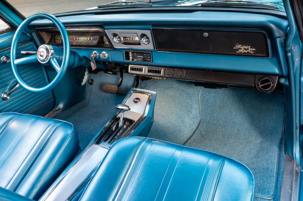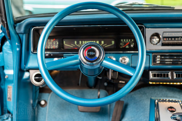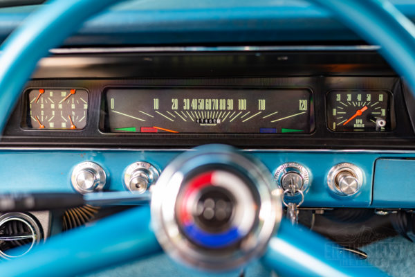 The big trick to pulling off a good restomod is to make things look like they did in the ’60s yet still provide modern amenities. Inside, this Nova looks just as you think it would — bone stock — but with subtle hints of modern upgrades. For instance, the reworked seat foam provides a little extra bolstering and cushioning while hiding seat heaters to keep Betty toasty. Another update we take for granted in the modern world is cruise-control, which you will see from Dakota Digital on the turn-signal stalk.