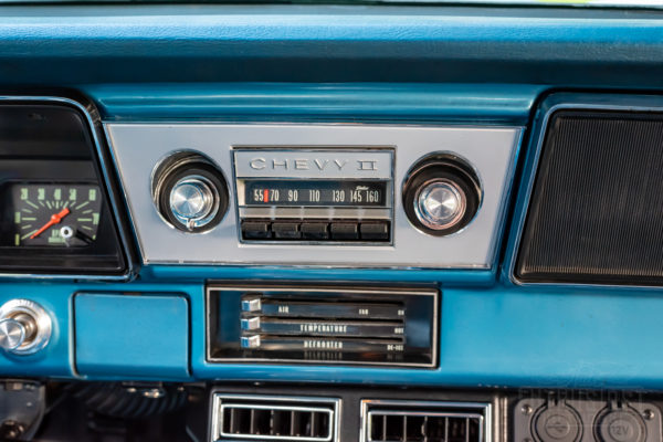 Beyond that, everything inside looks factory fresh. Yes, there’s Vintage Air we mentioned earlier, but you wouldn’t even know it from looking at the controls. Ok, a purist would notice the ididit RetroFit steering column and CON2R Gazelle two-spoke steering wheel adorned with the factory Nova horn button, but they both look right at home. Speaking of looking like it belongs, this dash houses the prototype of Classic Instruments new 66-67 Nova Direct-Fit instrument panel. It looks stock but has modern touches. How cool is that!
